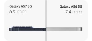 Galaxy A57 5G được hoàn thiện với khung nhôm, mặt kính Gorilla Glass Victus+, mỏng 6.9 mm và nặng 179 g, đạt chuẩn kháng nước bụi IP68. Galaxy A37 5G dùng khung nhựa, dày 7.4 mm, nặng 196 g, vẫn giữ thiết kế hiện đại và khả năng chống nước tương tự.