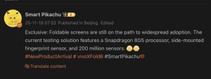 Rò rỉ mới cho biết Vivo X Fold 6 sẽ dùng cảm biến vân tay đặt cạnh viền, thay vì dưới màn hình như một số mẫu khác. Đây là chi tiết hiếm hoi liên quan đến phần cứng bên ngoài. Các yếu tố khác như độ mỏng, trọng lượng hay chất liệu hoàn thiện vẫn chưa được tiết lộ.